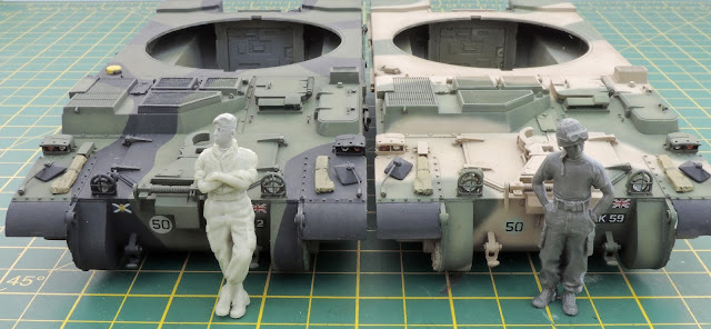 I've now finished off the lights on the model after adding three bars from thin plastic card on each side light / indicator pod. A tricky operation which in hindsight I should have done during construction. However it's done now after much swearing and general mumbling! The figures have also arrived from accurate armour and just the job they are too.