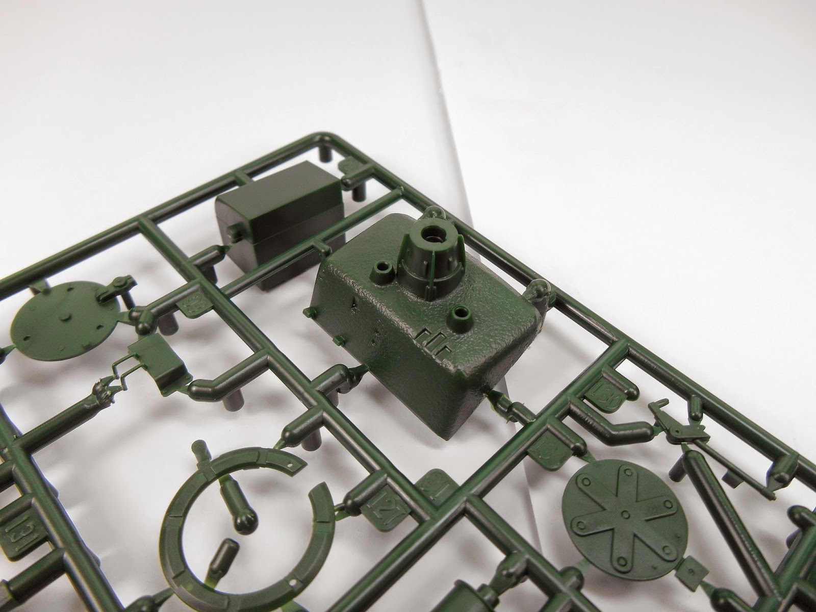 Parts D has the turret and stowage bins as the main components and again the turret has that dodgy texture cast in. The stowage bins all have their handles cast solid. The front lights are also cast with solid lenses, something found throughout the kit.
