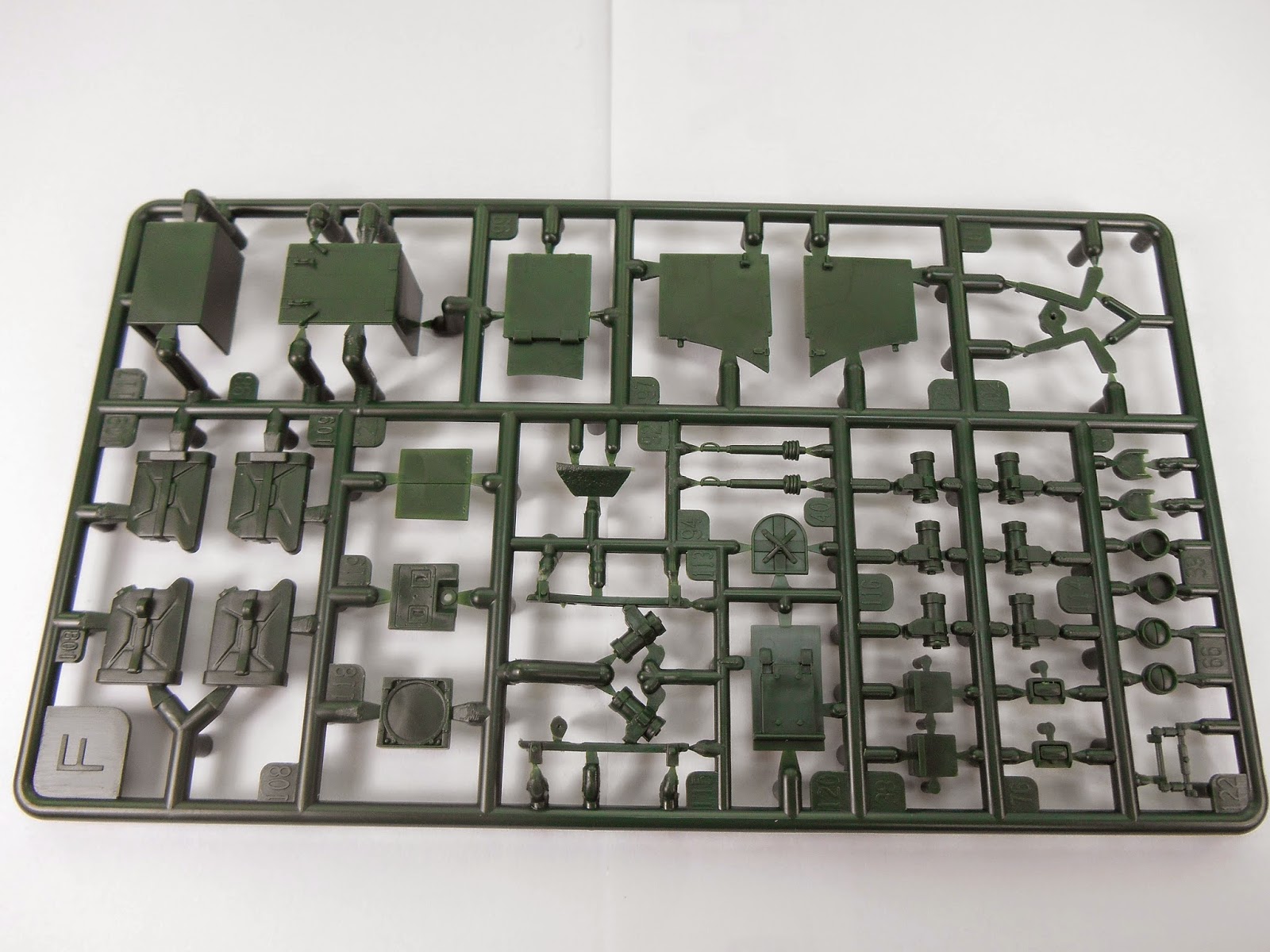 And lastly Parts F deals with most of the small parts needed for the details. Again much simplification is evident here with solid lights, a solid cast search light lens and rather chunky fuel cans.